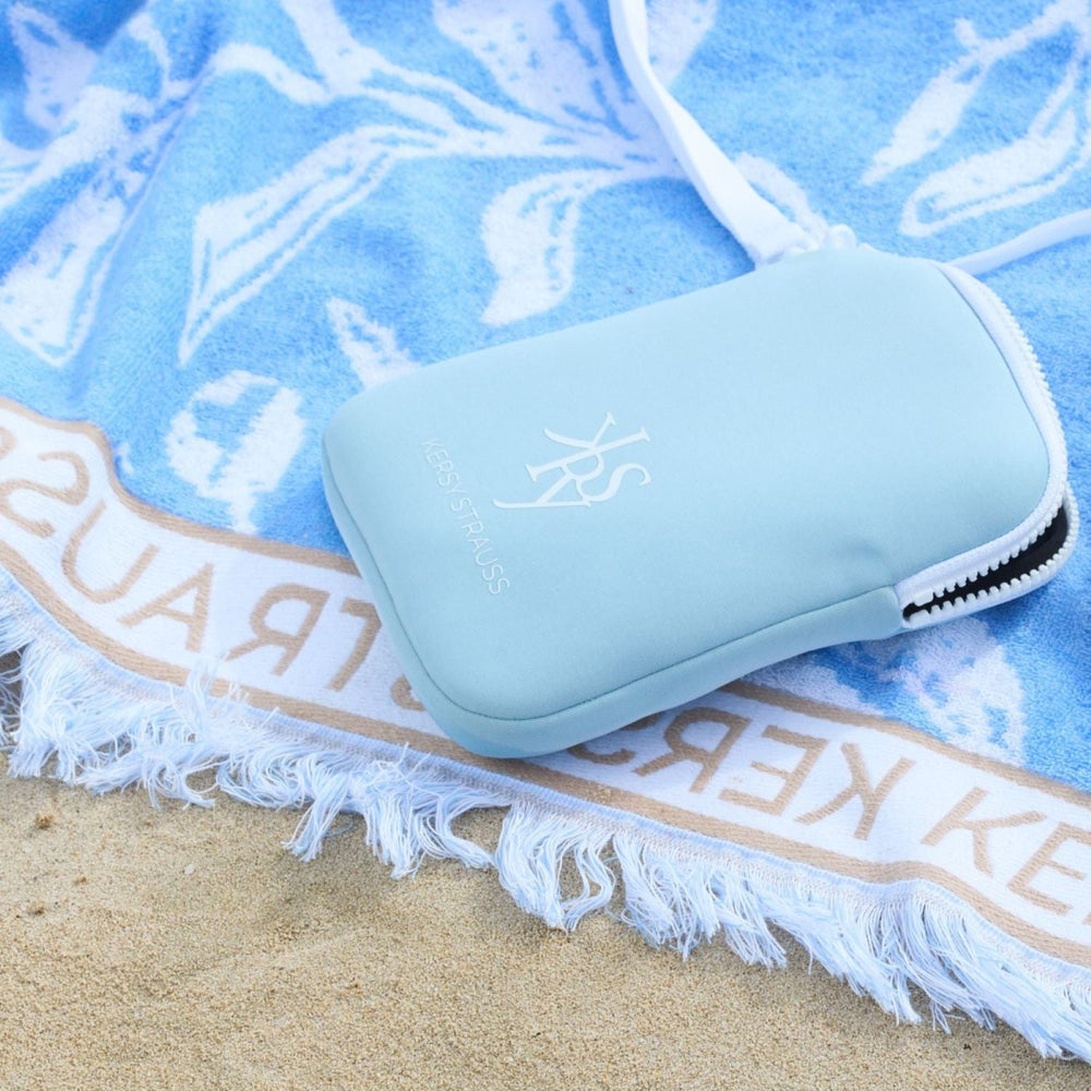 Nützlich-elegante Neo-Pouch. Schützt deine Valuables vor Salz und Sand, Wind und Wärme. Abnehmbarer Strap mit Karabiner, kann als Pouch oder Cross Over Bag getragen werden. Weißer Zipper.