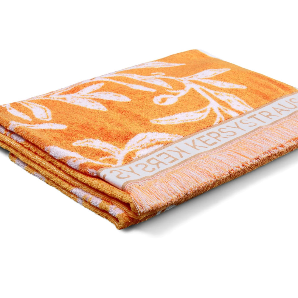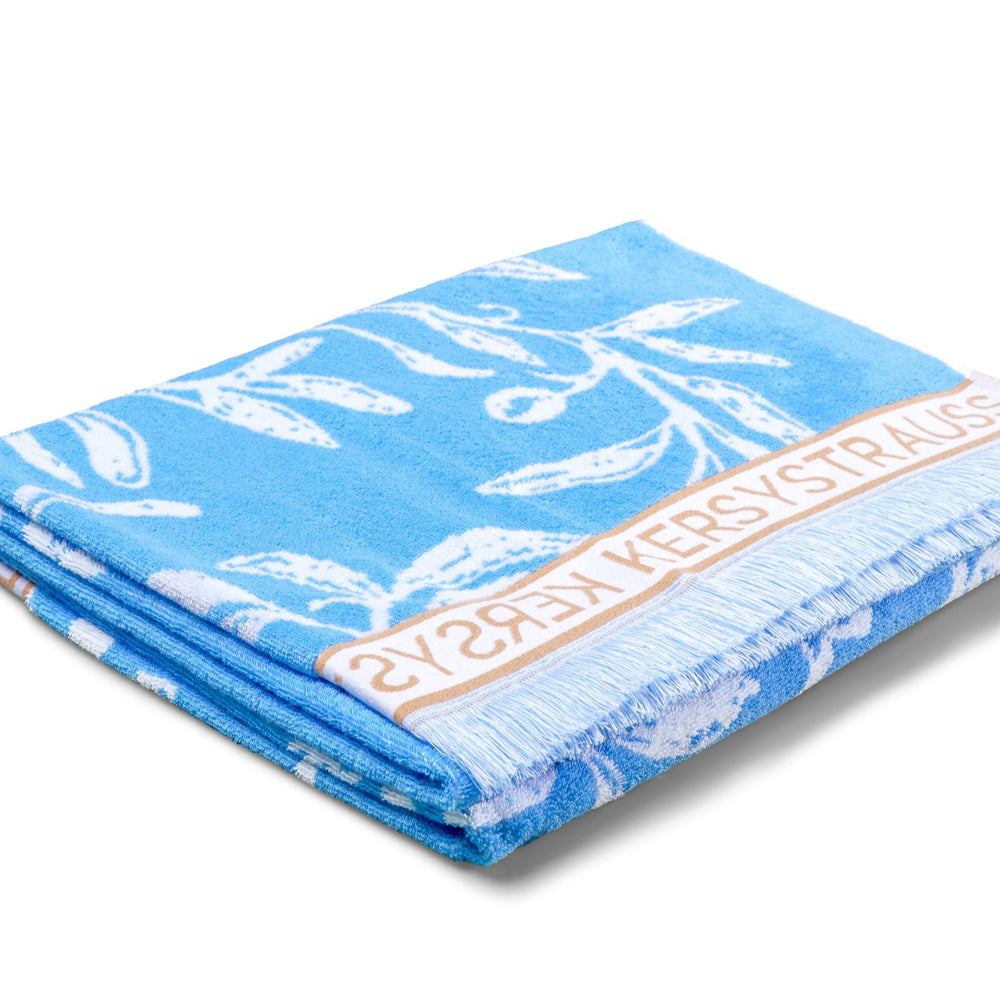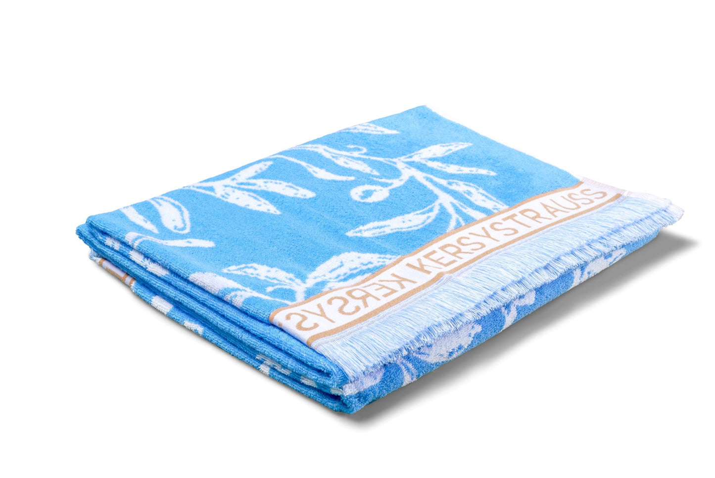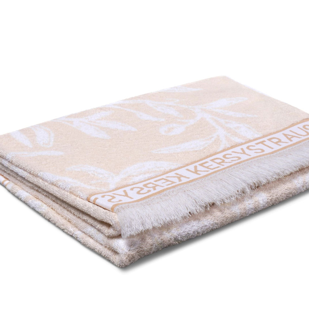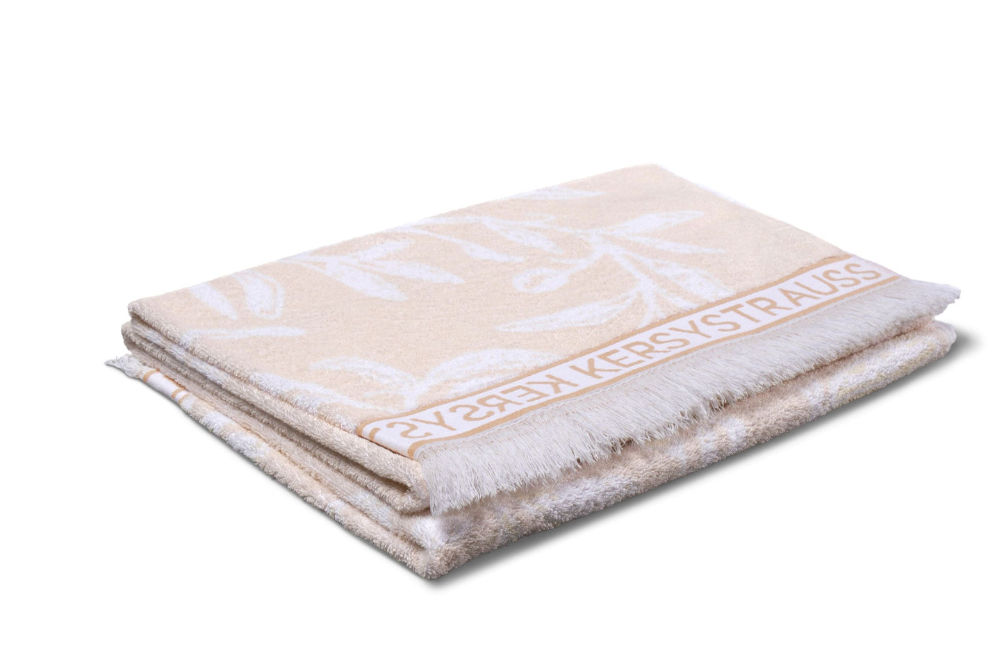 Stylisches Strandaccessoire aus weichem Frottee. Das gewebte Olivenmuster und die Fransenapplikationen verleihen dem Strandhandtuch einen modernen, lässigen Touch. Perfekt für entspannte Stunden am Strand!