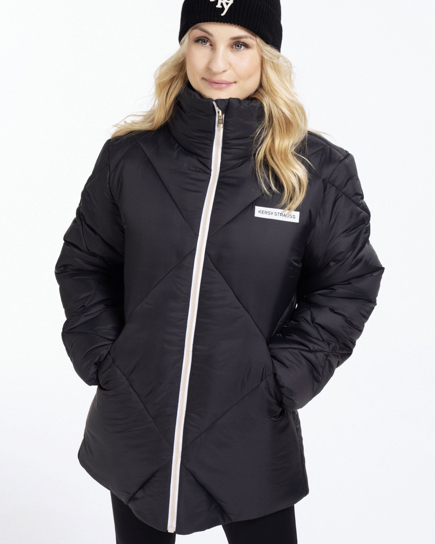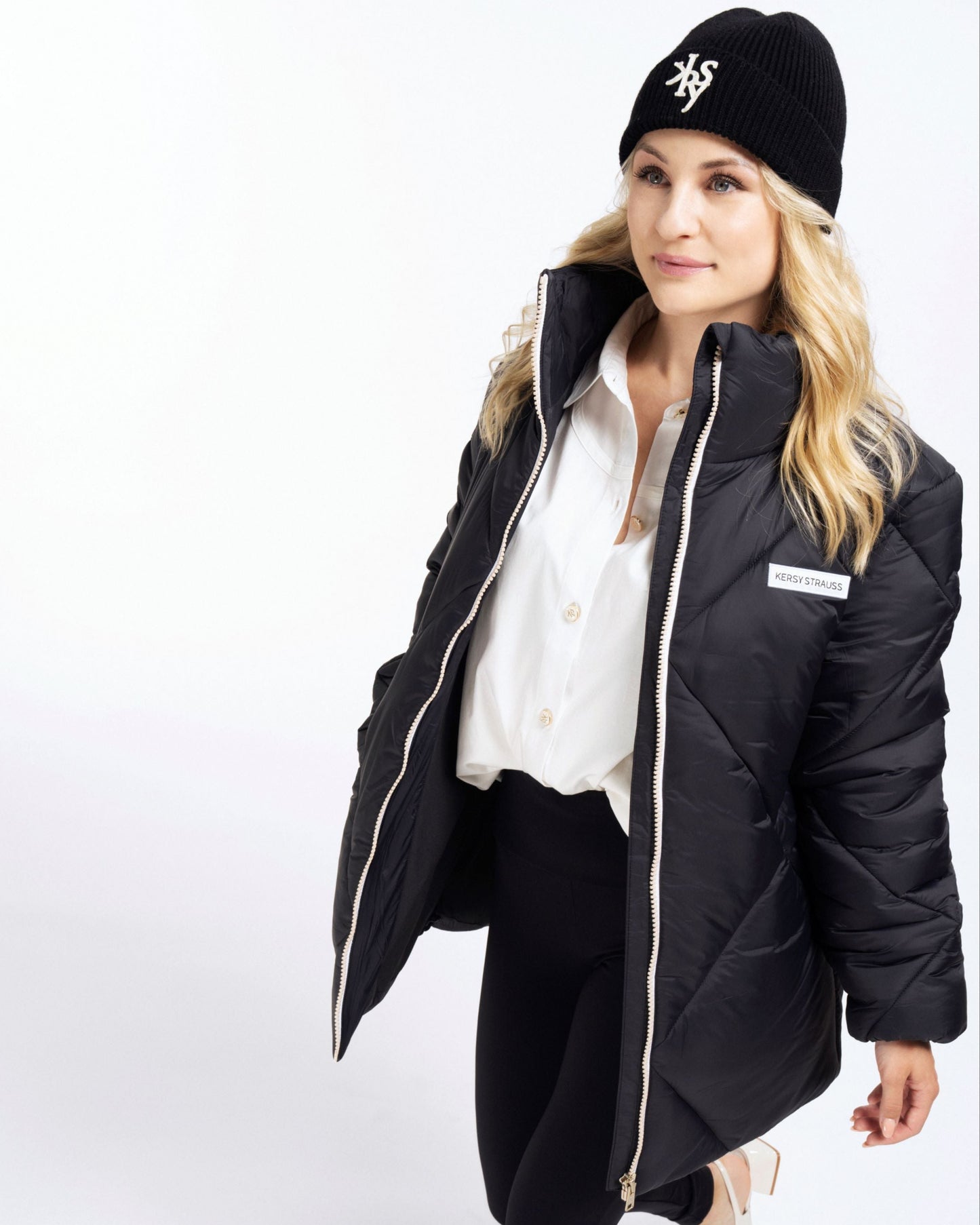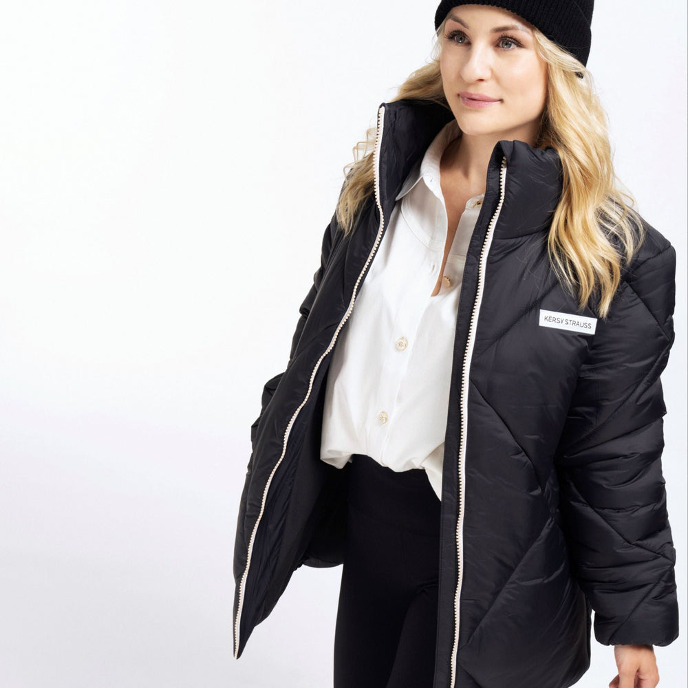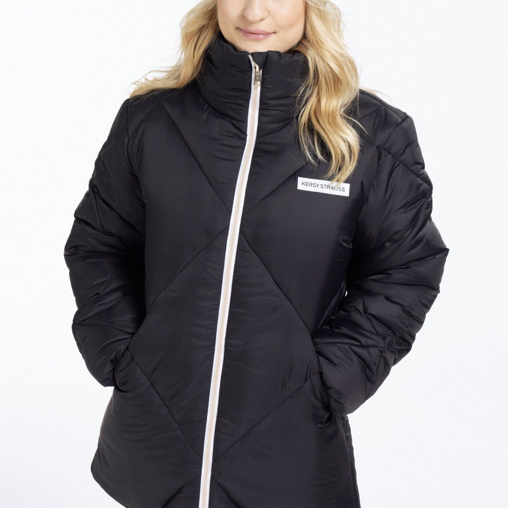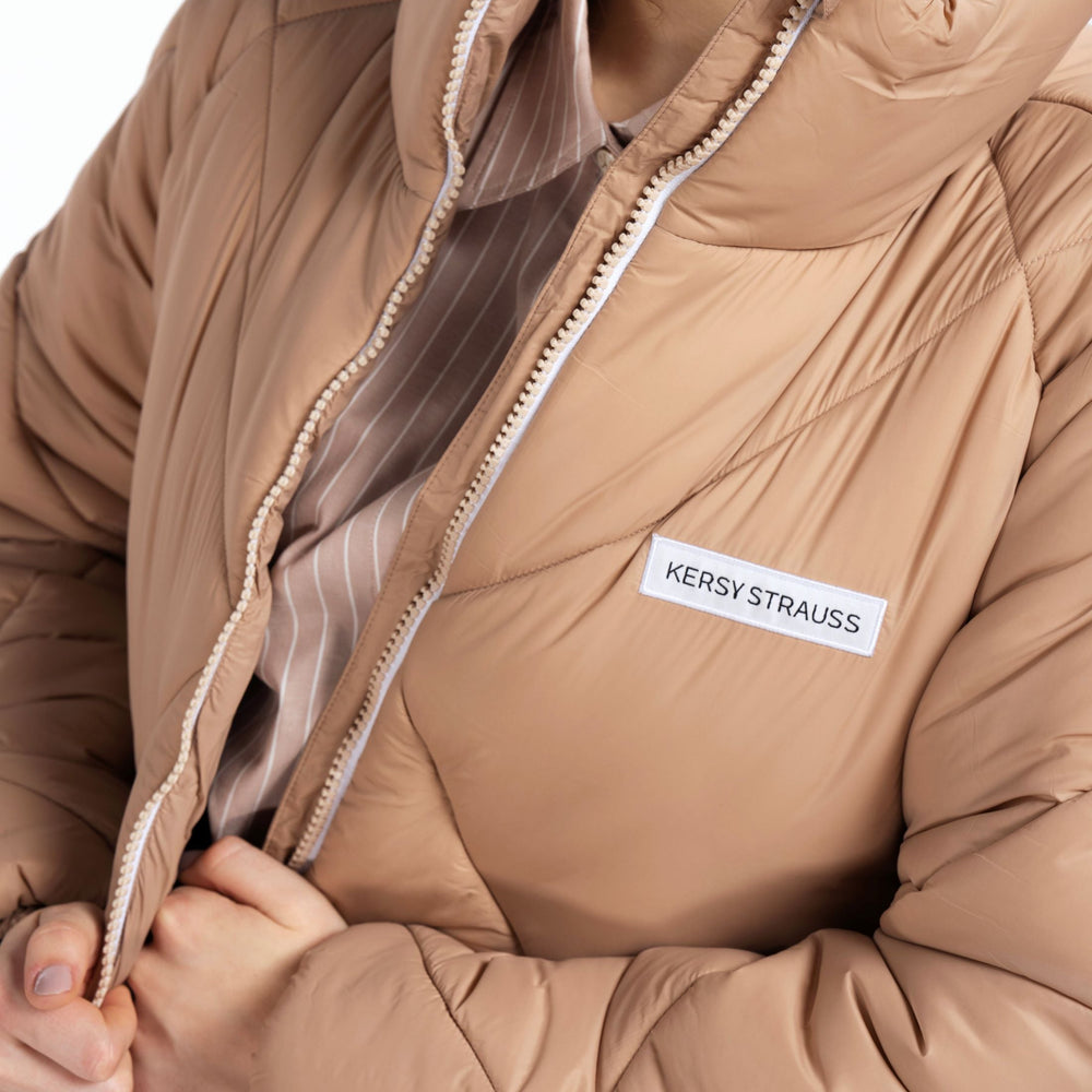 Ein lässiger unverwechselbarer Oversize Look aus Nylon. Die weiche Füllung wird mit elastischen Ärmelbündchen und einem Kordelzug am Bund kombiniert. Das Stitching ist im Diamond Look. Es gibt integrierte Außentaschen mit Reißverschluss. Der Zipper ist in KERSY Champagne Gold. KERSY Logo auf der Brust.