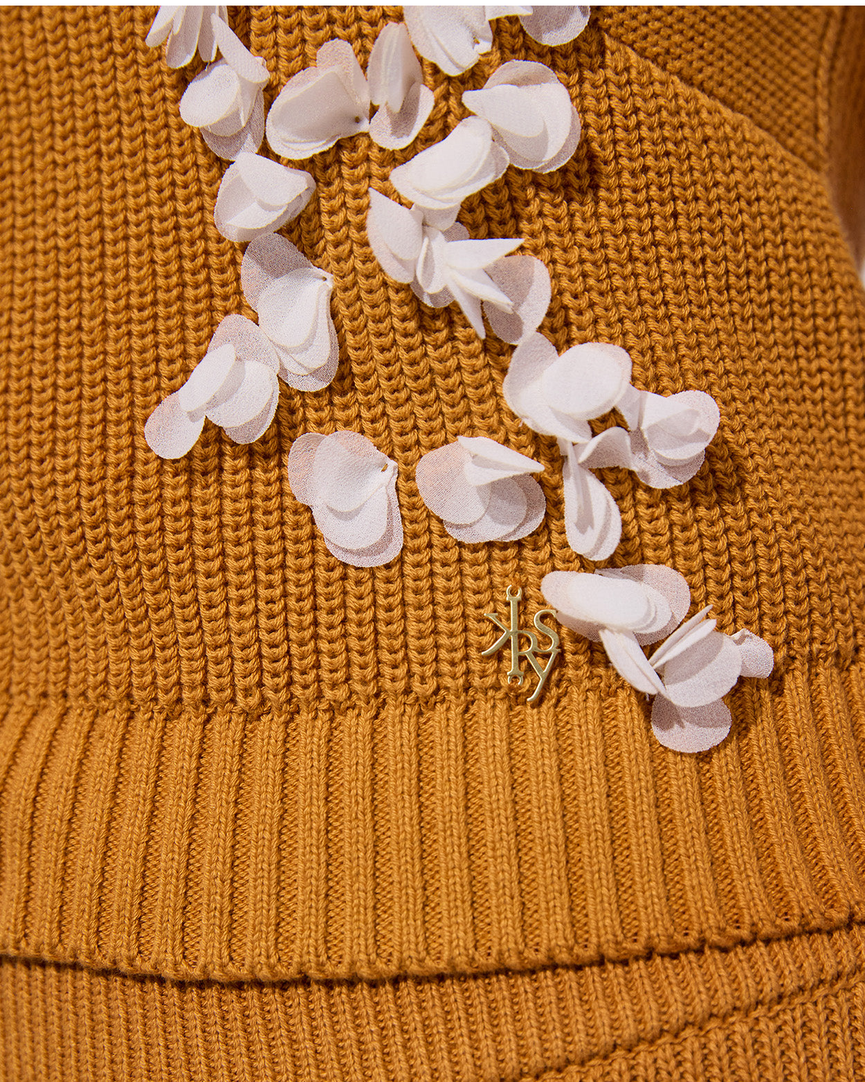 Dieses Corsagen-Top setzt auf Kontraste: Soft Knit trifft auf handgestickte Chiffonblumen im asymmetrischen Design. Die besondere Webtechnik im Brustbereich sorgt für Form und Fokus, während breite Rippenabschlüsse an Taille und Ärmeln die Silhouette definieren.