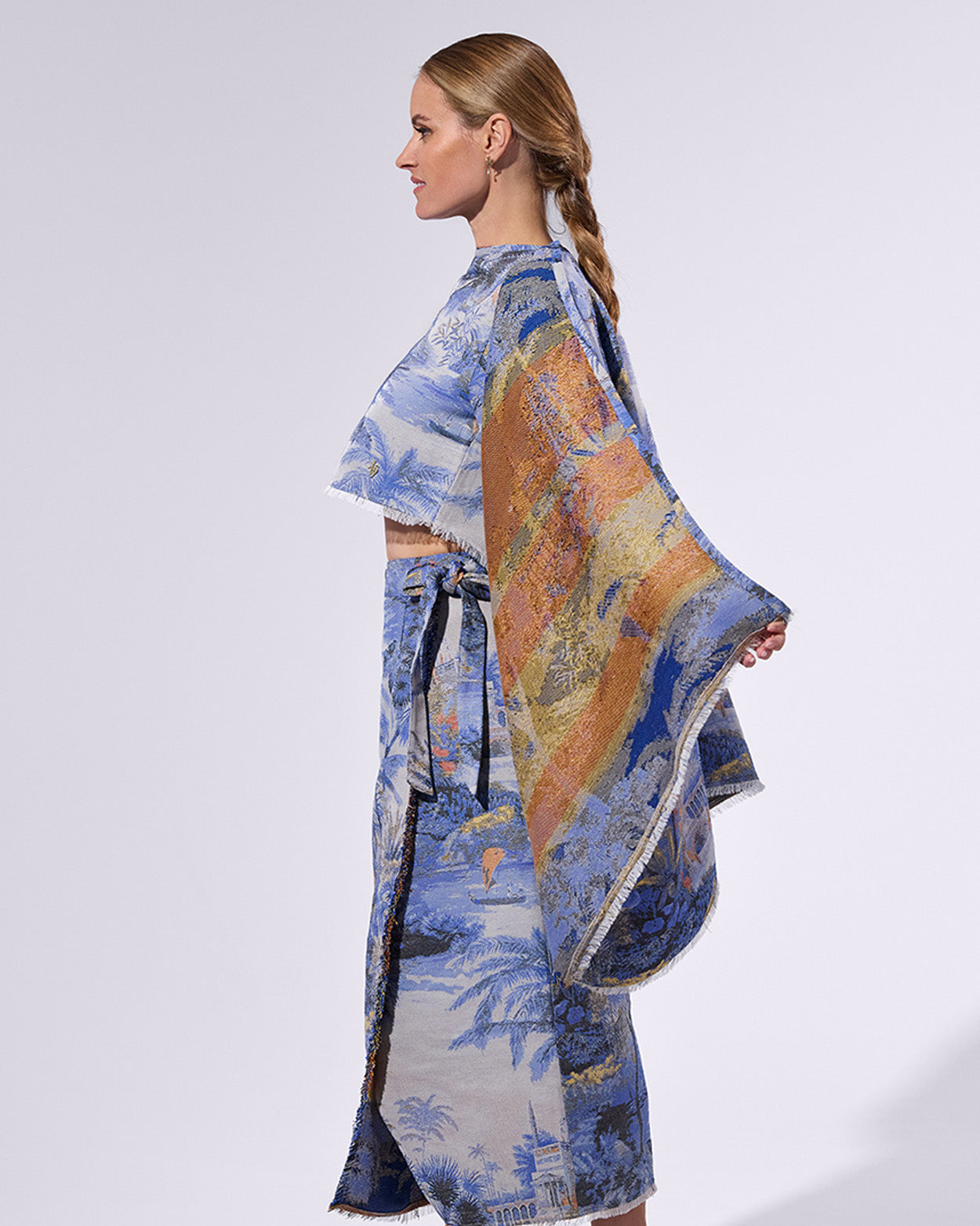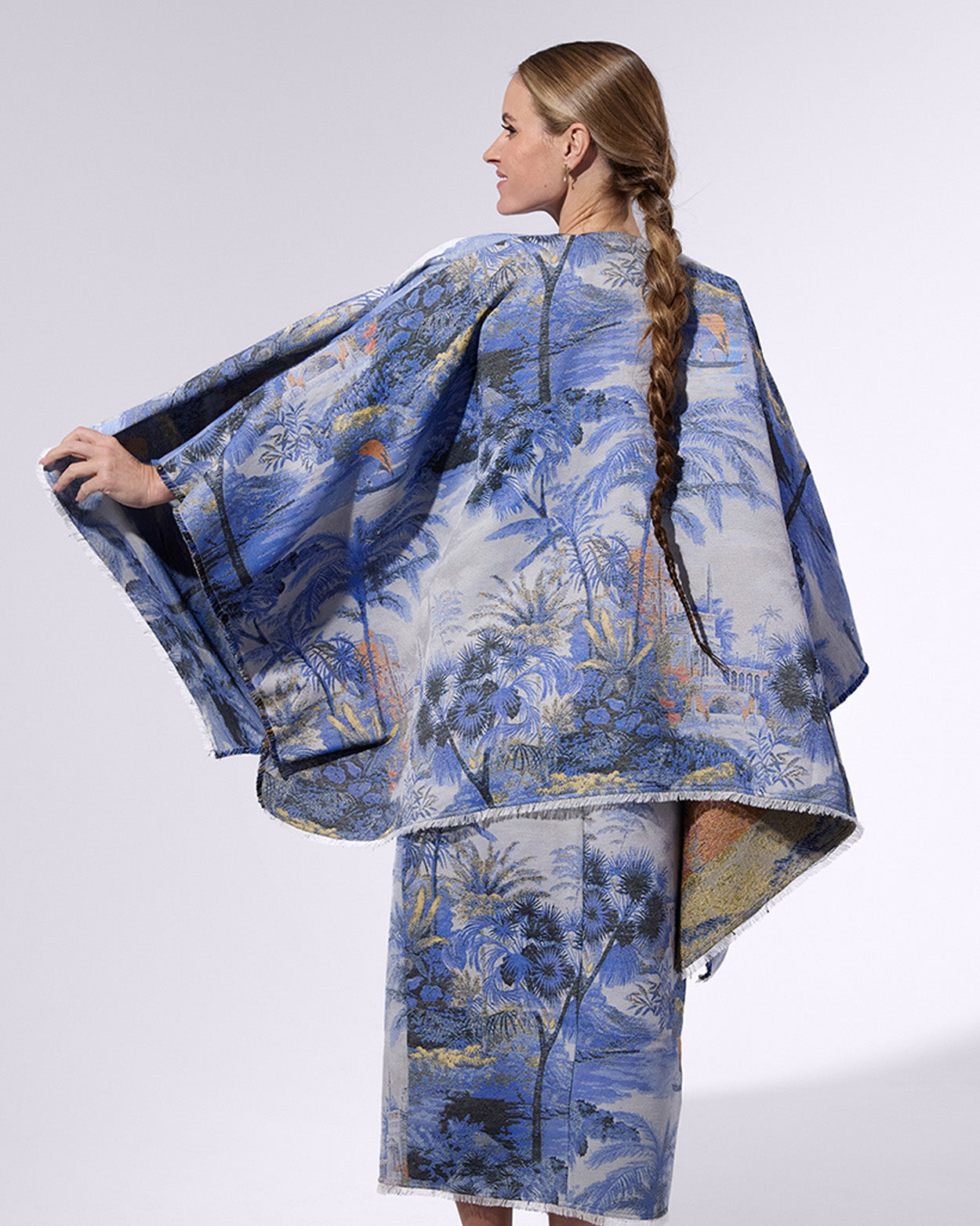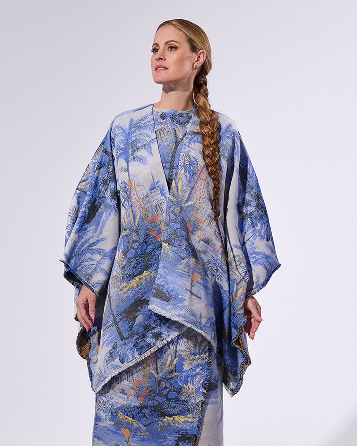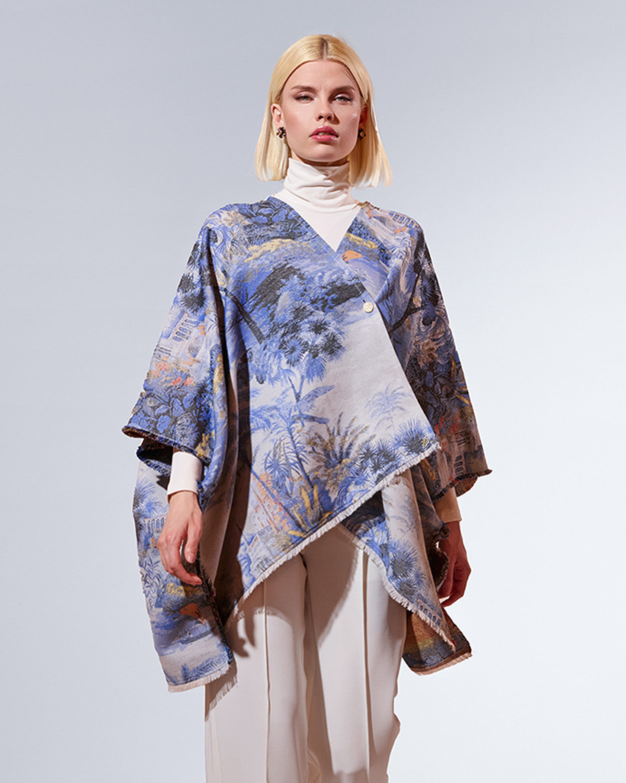 Unser Jacquard-Poncho kombiniert Komfort und Stil auf besondere Weise: Gefertigt aus hochwertigem Jacquard-Stoff mit einem einzigartigen Print, zieht er alle Blicke auf sich. Die verspielten Fransen an den Kanten verleihen dem Poncho eine lebendige und natürliche Note. Dank des praktischen Knopfs lässt sich der Poncho geschlossen tragen, wodurch eine asymmetrische Form entsteht.
