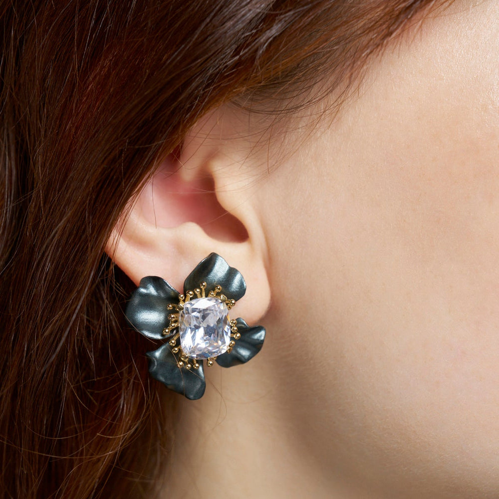 Die kunstvollen Blütenblätter sind aus Metall, der kristallene Stein in der Mitte wird umrandet von goldenem Blütenstaub. Der goldene Stecker wird durch einen Clip Verschluss mit Gummi gehalten.