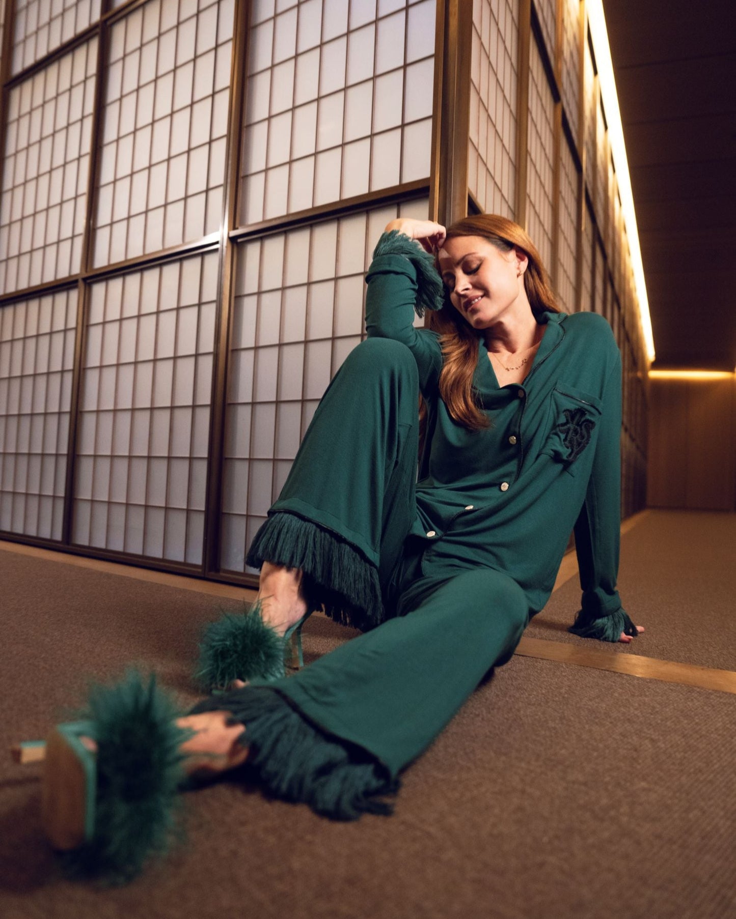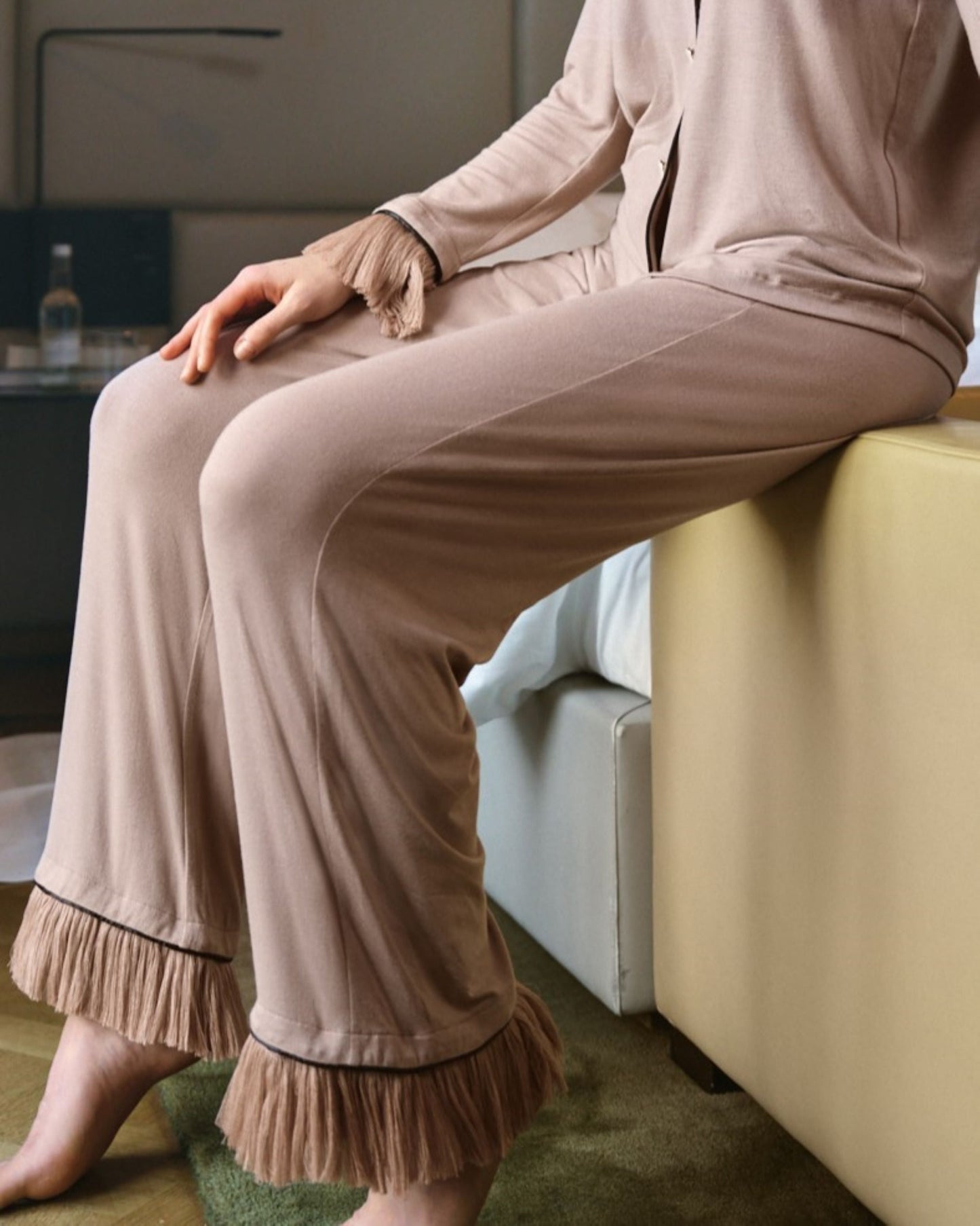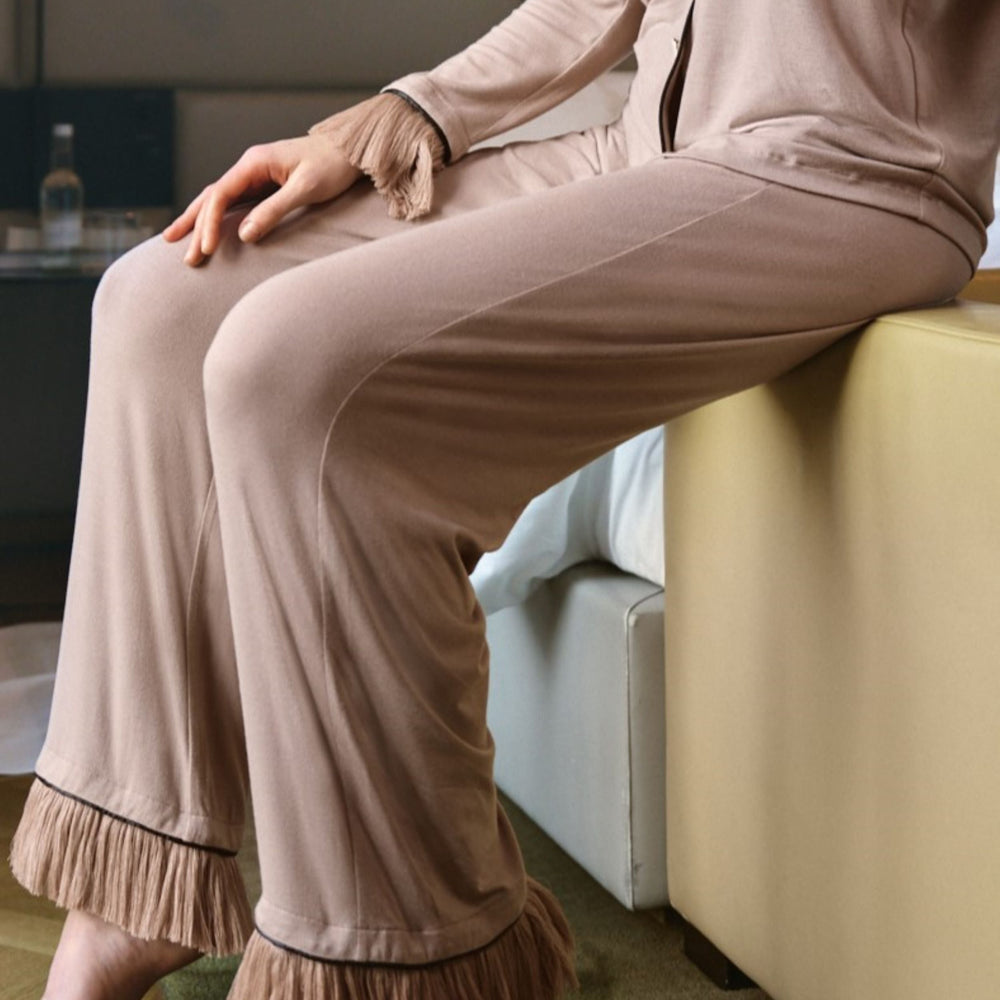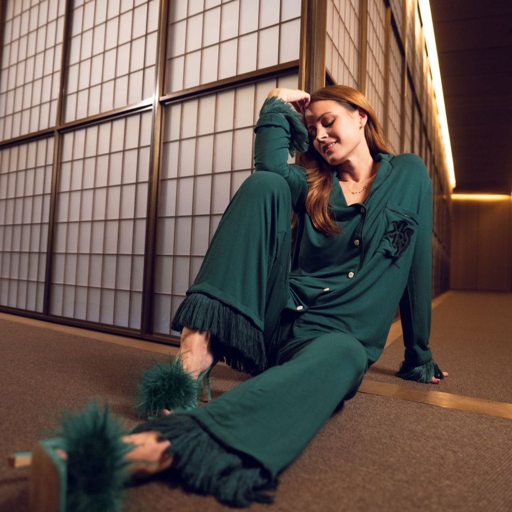 Der KERSY Studio Modal Pyjama ist durch sein unglaublich weiches Modal Material ein Must Have. Die Fringes am Beinsaum sind abnehmbar. Die Passform ist normal, etwas weiter. Durch die Fringes ist der Pyjama absolut alltagstauglich. Die Fringes können ganz einfach durch die Druckknöpfe zum Waschen entfernt werden. Wir empfehlen sie zum Waschen zu entfernen. Alle Nähte sind mit einem Satinband eingefasst. Die Passform ist normal, etwas weiter.