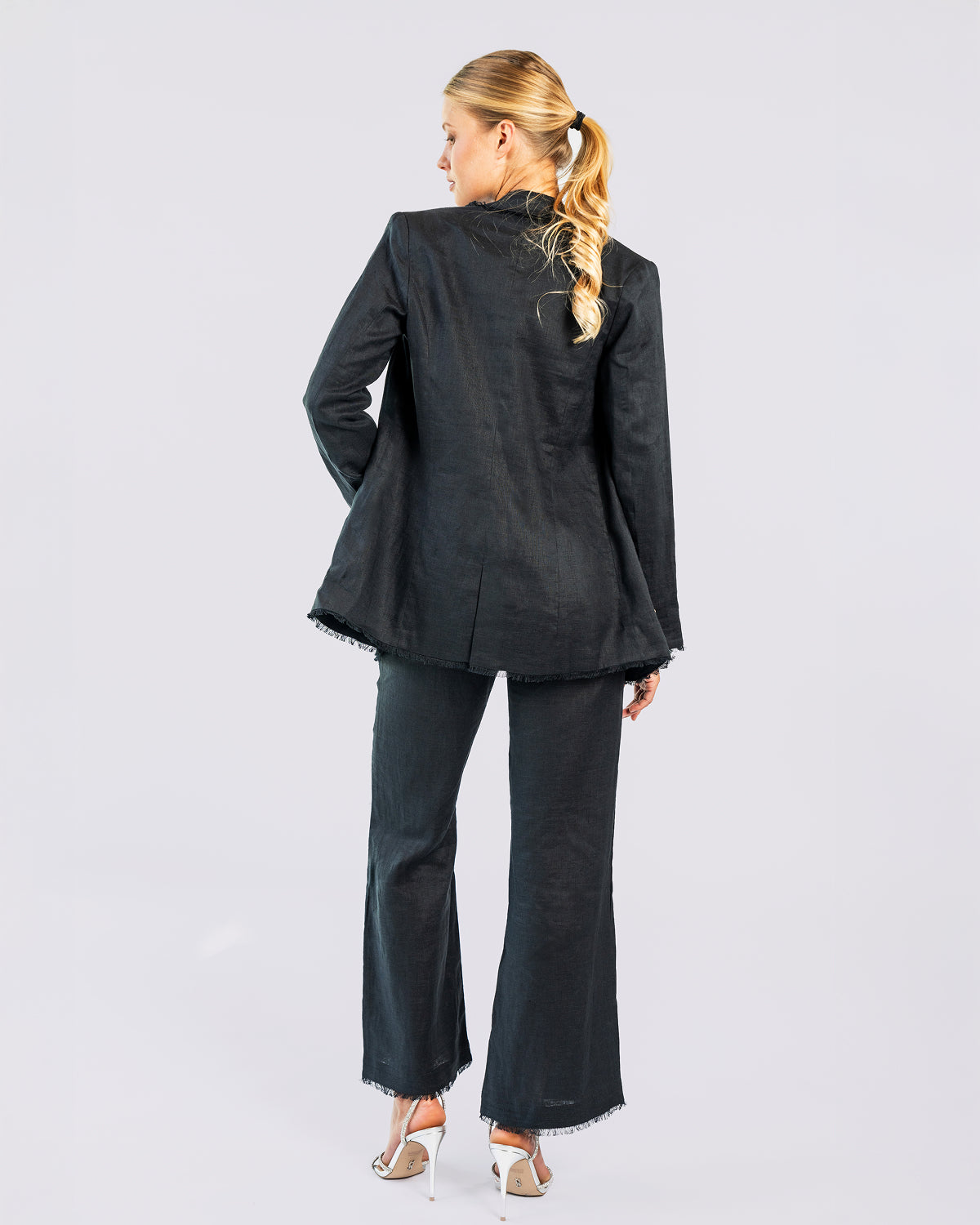 Le pantalon léger en 100% lin allie confort et style. Avec sa taille haute et sa coupe décontractée, il offre un confort parfait. La ceinture décorative en lin et les poches latérales confèrent au pantalon une élégance décontractée. Les franges au bas des jambes et les boutons en nacre avec le logo KERSY apportent des touches stylées, tandis que la fermeture boutonnée et zippée à l'avant assure un ajustement parfait. Idéal pour un look estival décontracté !