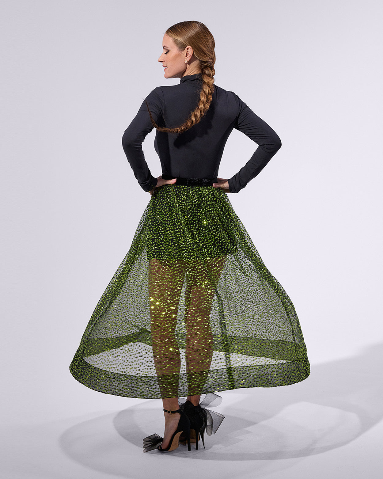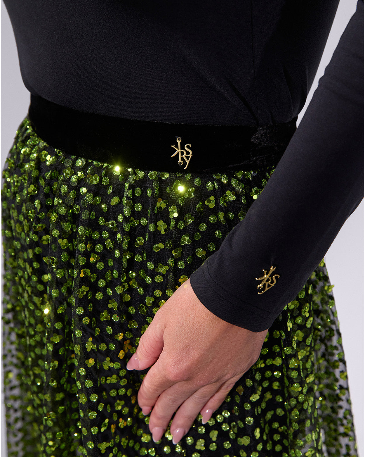Cette jupe en tulle souple, longueur cheville, scintille de paillettes couleur émeraude et met parfaitement en valeur votre silhouette grâce à ses légères fronces à la taille. La bande en nylon à l'ourlet crée une silhouette trapèze épurée, tandis que la large ceinture en velours ornée du logo KERSY doré apporte une touche de sophistication. La transparence rencontre la structure : le jupon court garantit un confort optimal.