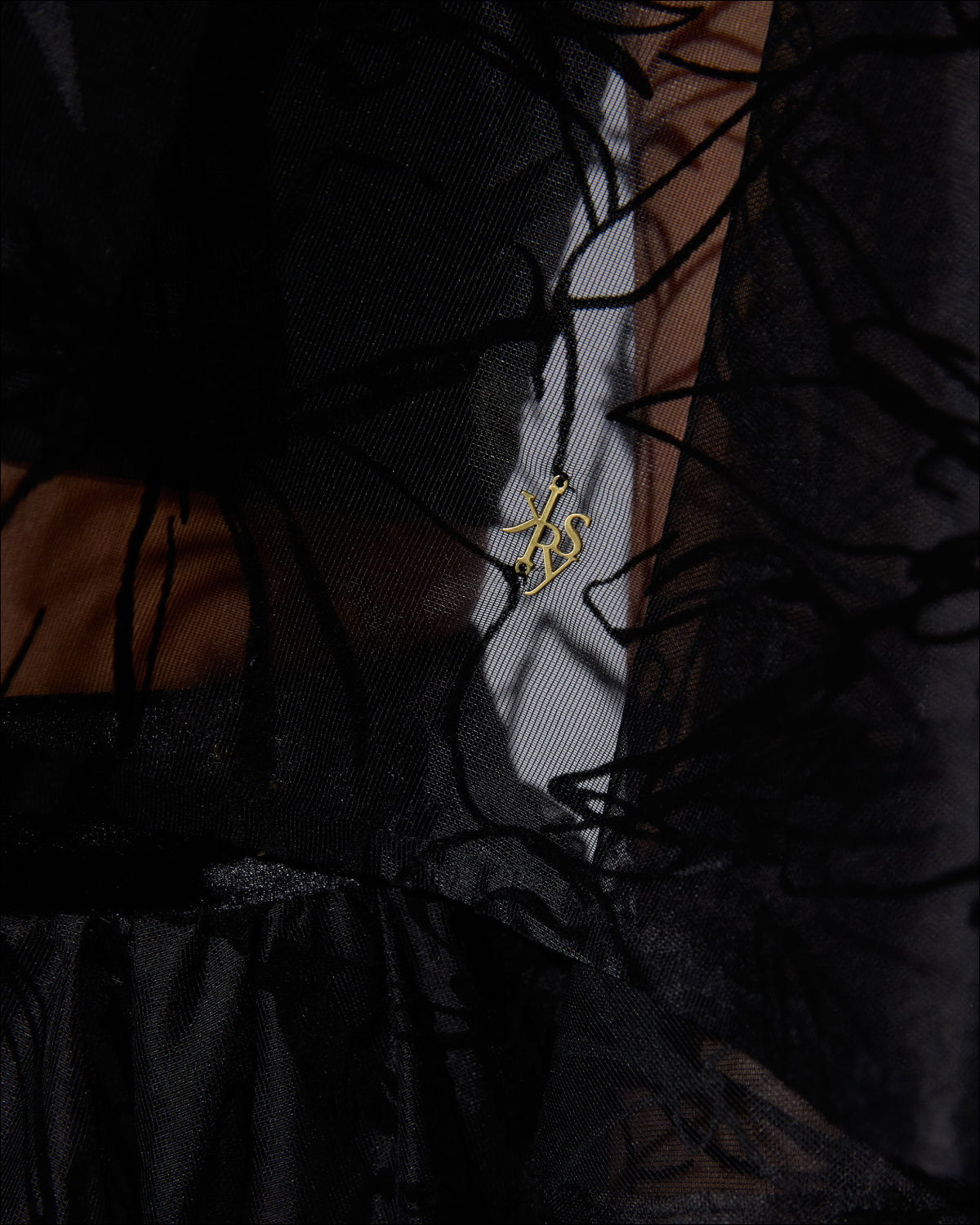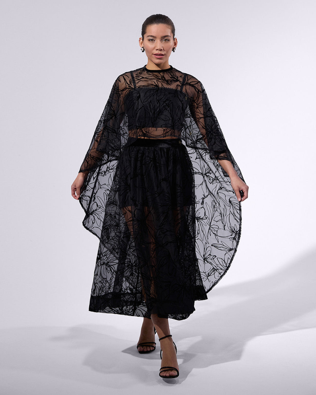 Ce haut léger et transparent en tulle doux floqué, réalisé selon la technique du burn-out, séduit par sa délicate transparence et son jeu de matières délicat. Le fin galon de velours autour du col apporte une touche sophistiquée, tandis qu'un petit bouton à œillet dans le dos ferme élégamment le col. La coupe courte devant se prolonge par une douce traîne dans le dos.